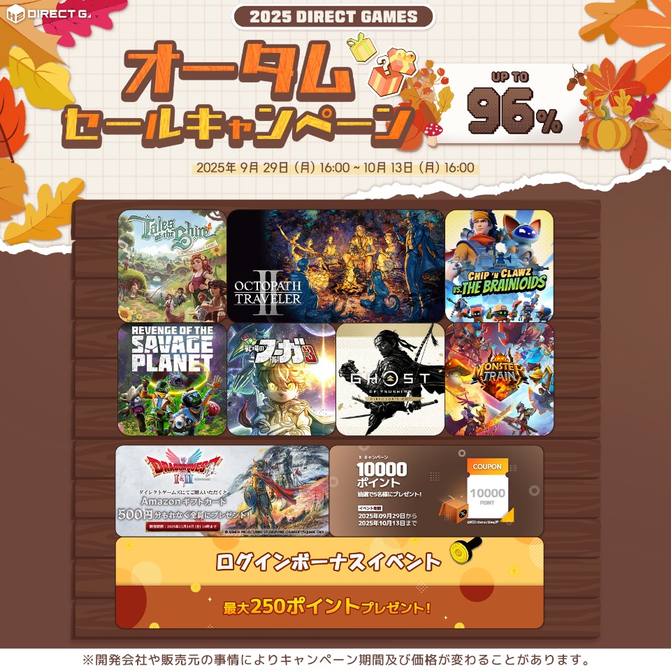 PCゲームデジタルキー公式販売サービスDIRECT GAMESにて『2025オータムセールキャンペーン』を開催中です。